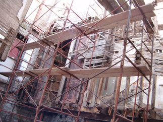 was layed in place and the roof was decked and covered with a water tight membrane. Plumbing work included excavating new sewer and water supply lines and setting internal stacks and supplies for all plumbing fixtures. A new concrete floor was poured in the basement with rear exit steps. Electrical work centered on the installation of service panels and distributed lines for all electrical fixtures. HVAC duct work, furnaces, and heat pumps were put in place. The double glass windows were set into the large original brick wall openings. The roof, walls and floors were heavily insulated for both energy conservation and noise reduction.